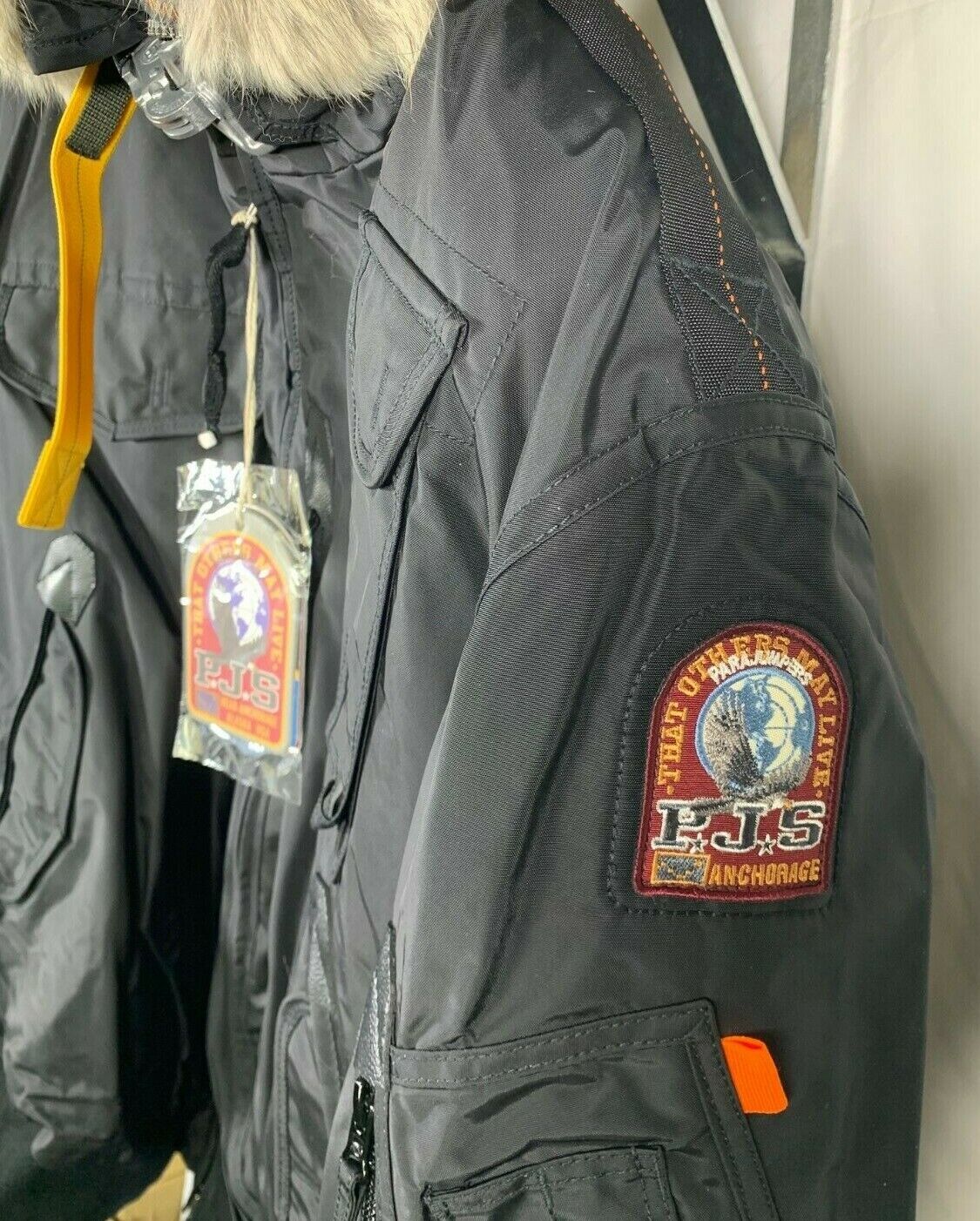 Hooded bomber with detachable real fur trim and removable down-filled lining. The hood is adjustable by means of a drawstring. The jacket is crafted in recycled nylon oxford with fabric protector treatment and inner polyurethane lamination. Taped seams on hood, shoulders and armholes. Multiple pockets include a capacious cargo pocket in front, containing a mesh pocket, as well as two inner pockets and a pocket on the left sleeve. Reinforced patches at the elbows. Ribbed cuffs and bottom. Two-way front zipper. Iconic yellow PJS snap-hook neck closure and PJS patch on left sleeve.